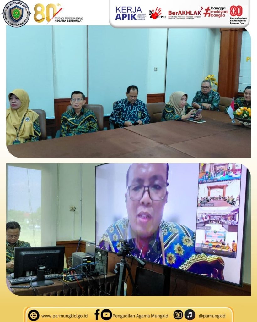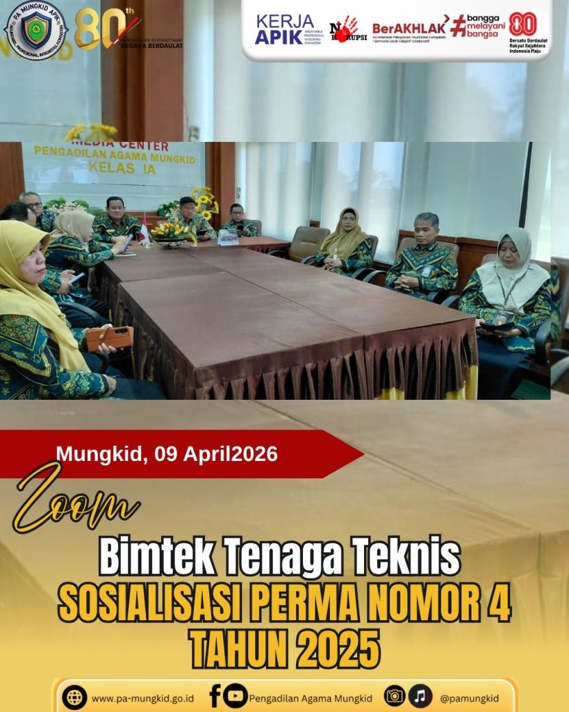 Mungkid, 9 April 2026 — Bertempat di ruang Media Center Pengadilan Agama Mungkid, Ketua, Wakil Ketua, para Hakim, Panitera, Panitera Pengganti, serta Panitera Pengganti dari Pengadilan Tinggi Agama Semarang yang diperbantukan di Pengadilan Agama Mungkid mengikuti kegiatan Bimbingan Teknis (Bimtek) secara daring yang diselenggarakan oleh Direktorat Jenderal Badan Peradilan Agama.